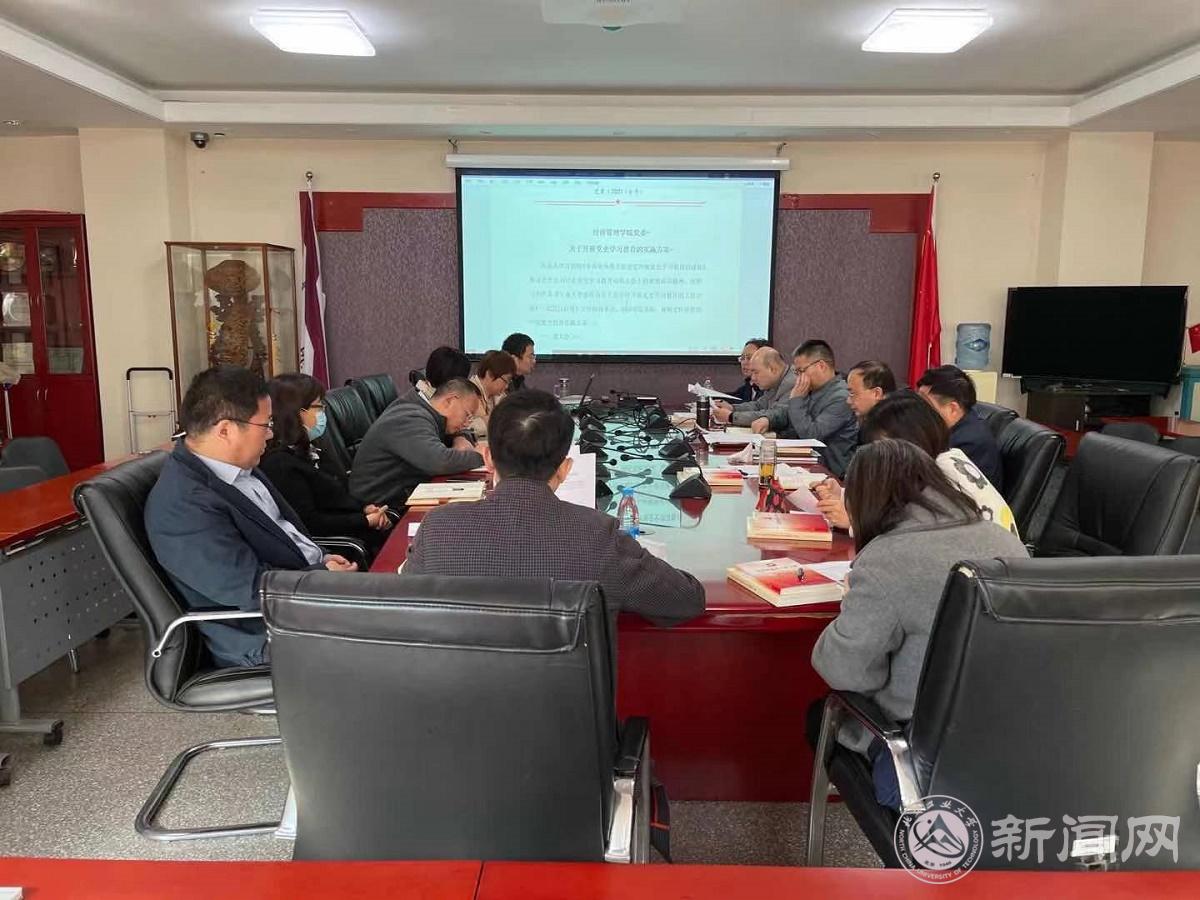 他指出,党史学习教育是一项政治任务,既是对过往的总结,又是站在两个一百年历史交汇处上的新起点,既是对理论的深入学习,又是对实践的不断总结。他强调,学院党委委员和各党支部书记作为学院和各支部的领头人,要牢牢把握此次党史学习教育的“学党史、悟思想、办实事、开新局”的总要求,以学党史、悟思想作为出发点,以办实事、开新局作为落脚点,工作中坚持“学史明理、学史增信、学史崇德、学史力行”,通过个人自学、交流研讨、集体学习、专题调研等方式提高学习质量和学习效果。他要求,各支部要根据学校党史学习教育的实施方案,细化学习计划,将各个环节的工作明确到点具体个人,夯实责任,要结合支部的日常工作有序推进各项工作,确保党史学习教育扎实有效开展。