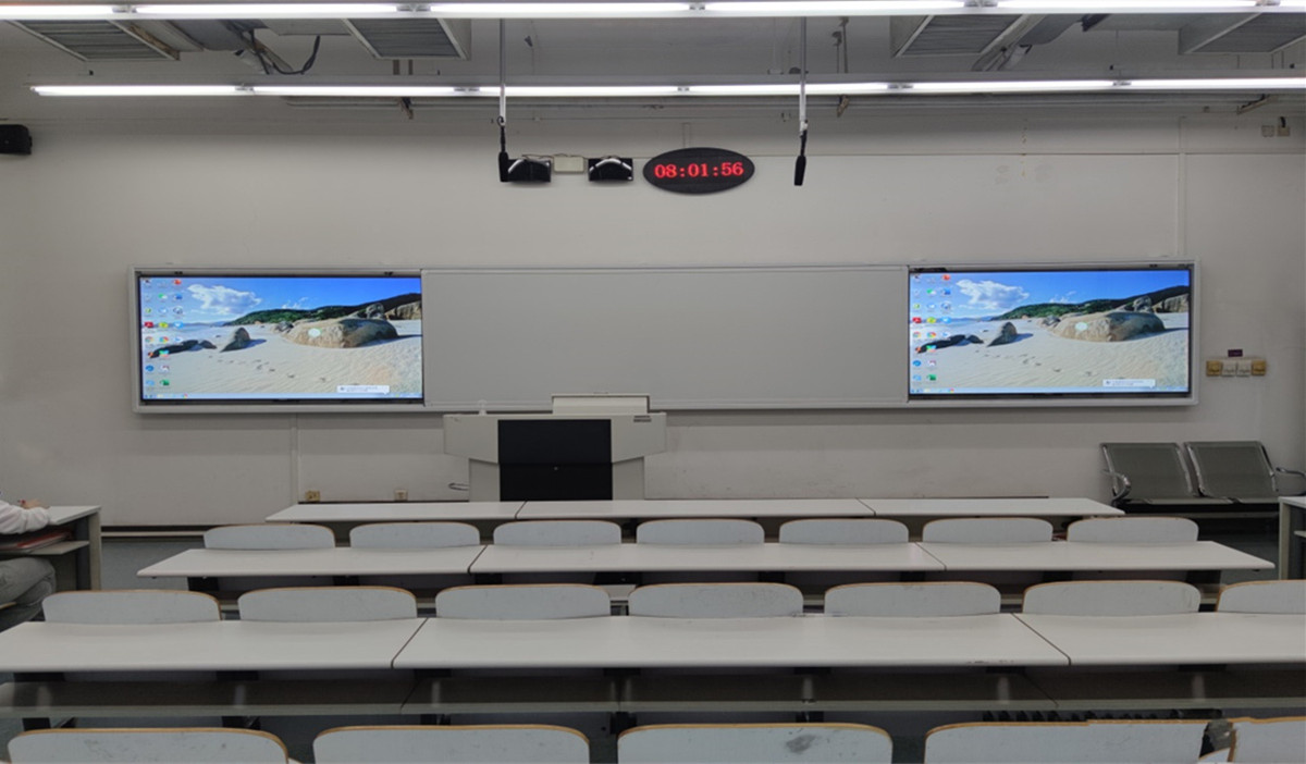 疫情发生以来,教师授课从现场教学向线上线下同步教学转换。网信中心针对教学新模式和师生新需求,在智慧教室、公共教室及博远楼机房的教学信息技术方面勇于创新(图5),利用寒暑假,解决了大规模高并发直播录播授课的各类技术难题,完成教室课程资源录播建设项目,实现了公共教室、机房和会议室同步直播录播,满足了线上线下同步教与学的需求,保证了所有同学都能获得优质的听课质量,让每一个学生不因疫情而耽误学习,为兄弟院校返校复学提供了经验。此外,今年暑期完成浩学楼东全部12间阶梯大教室(图6)和励学楼220、211,瀚学楼103小教室样板间(图7)的多媒体设备改造工作,根据各教室的不同大小和布局,大教室采用多屏显示、蓝牙麦克扩音等方式,提升教学技术手段和环境条件,力求课件呈现无死角、声音传输无盲区;试点多功能白板、无感知考勤、无线投屏等便捷教学手段;试点小教室不同形式样板间建设,拟通过征求师生学期的使用反馈意见,为明年全部小教室多媒体改造提供参考经验,脚踏实地推动教育教学与信息化技术深度融合。