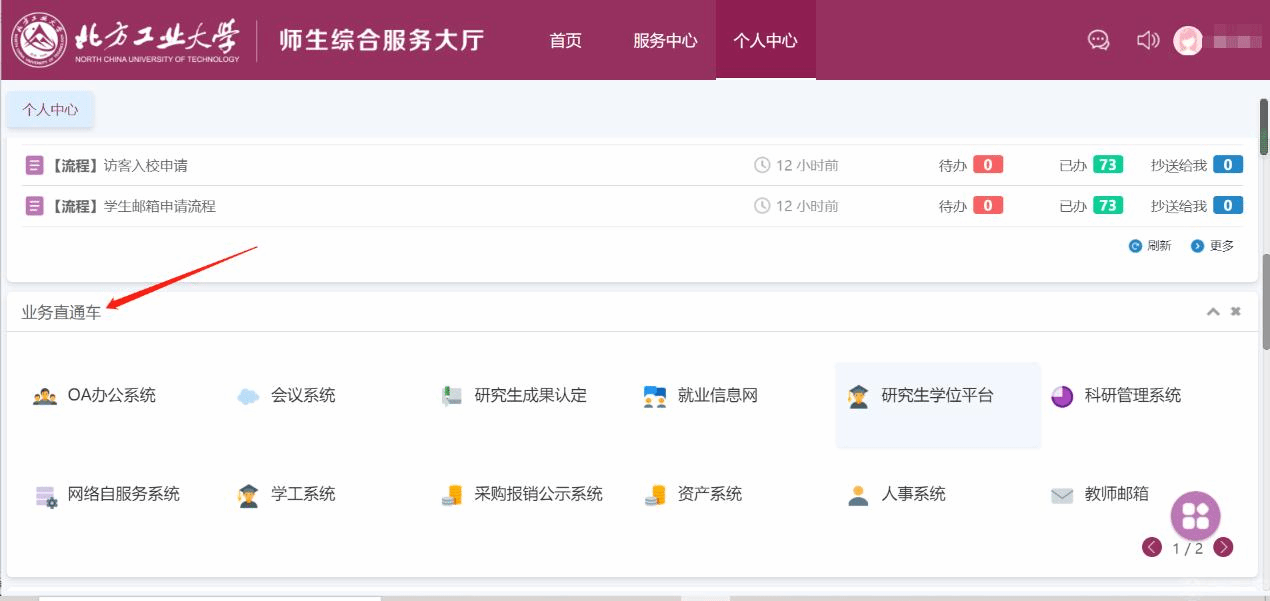“师生综合服务大厅”(http://service.ncut.edu.cn/),为一站式网上综合服务平台,实现一次登录认证畅行众多系统,如OA系统、研究生成果认定、教务系统、邮件系统、学工系统、网络教学平台等27个系统,老师和学生点击系统图标,不用二次登录,直接跳转至应用系统内部;提供多种业务办理流程,包括协作单位入校申请、学生出校申请、体育馆一层羽毛球预约、学生体测预约申请、选课等51个流程,老师和学生在校内办理相关申请和事务时,申请人只需在“服务大厅”内提交申请,系统将自动推送到相应的审批人处进行审批或办理,办理完成或需要申请人做补充处理时,系统都会向申请人自动推送提醒,申请人也可以随时在“服务大厅”了解流程审批进度,再也不需要奔波于学校各部门间签字盖章。