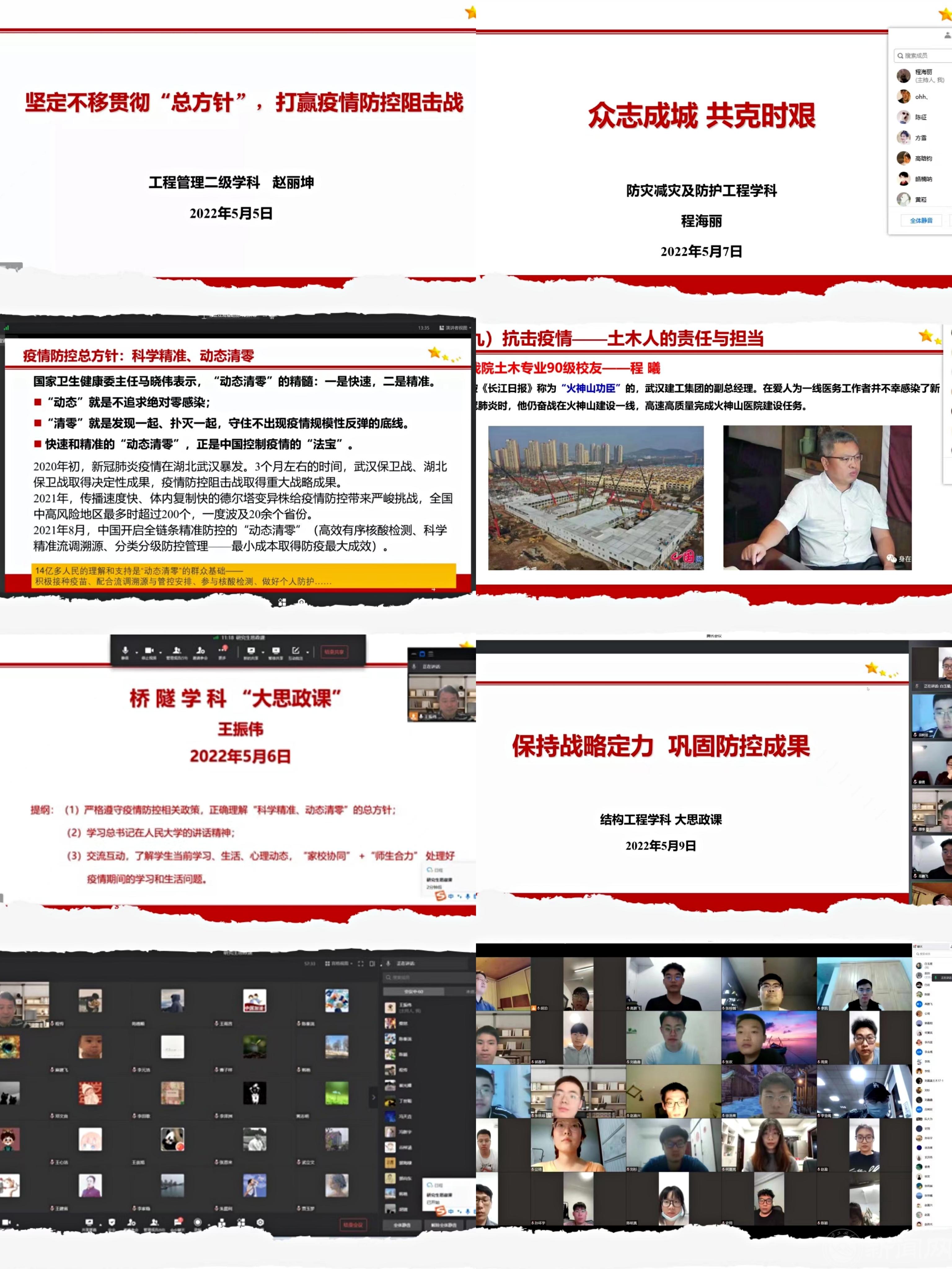 面对最近严峻复杂的疫情形势,土木工程学院高度重视疫情防控工作,认真贯彻落实习近平总书记对疫情防控工作的重要指示精神和学校相关疫情防控政策,始终坚持人民至上、生命至上,坚持科学精准、动态清零,尽快遏制疫情扩散蔓延势头的疫情防控方针,密切关注特殊时期师生的思想动态,聚焦正确认识当前疫情形势和政策深入开展宣传教育,引导全体师生科学理性对待疫情,严格落实疫情防控要求,组织开展好疫情防控“大思政课”。