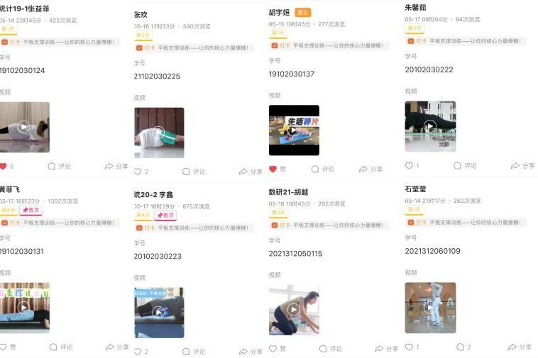 在第一阶段的活动中,理学院号召参赛同学于5月14日-5月18日内进行“平板支撑”力量训练,并拍摄运动视频与App截图打卡,共收到来自361名同学的875次精美打卡视频。并于5月19日,派出在第一阶段打卡过程中积极备赛、坚持锻炼的35名运动达人参加学校举办的腾讯会议线上挑战赛。在此过程中,同学们积极关注、踊跃参与、认真准备,以持之以恒的锻炼保持健康体魄,以酣畅饱满的精神迎接美好未来。在打卡视频中,同学们都十分认真,动作非常标准,展现了理院学子积极参与体育运动“拼搏,进取,青春,活力”的精神风貌,很多同学都养成了坚持锻炼的好习惯。