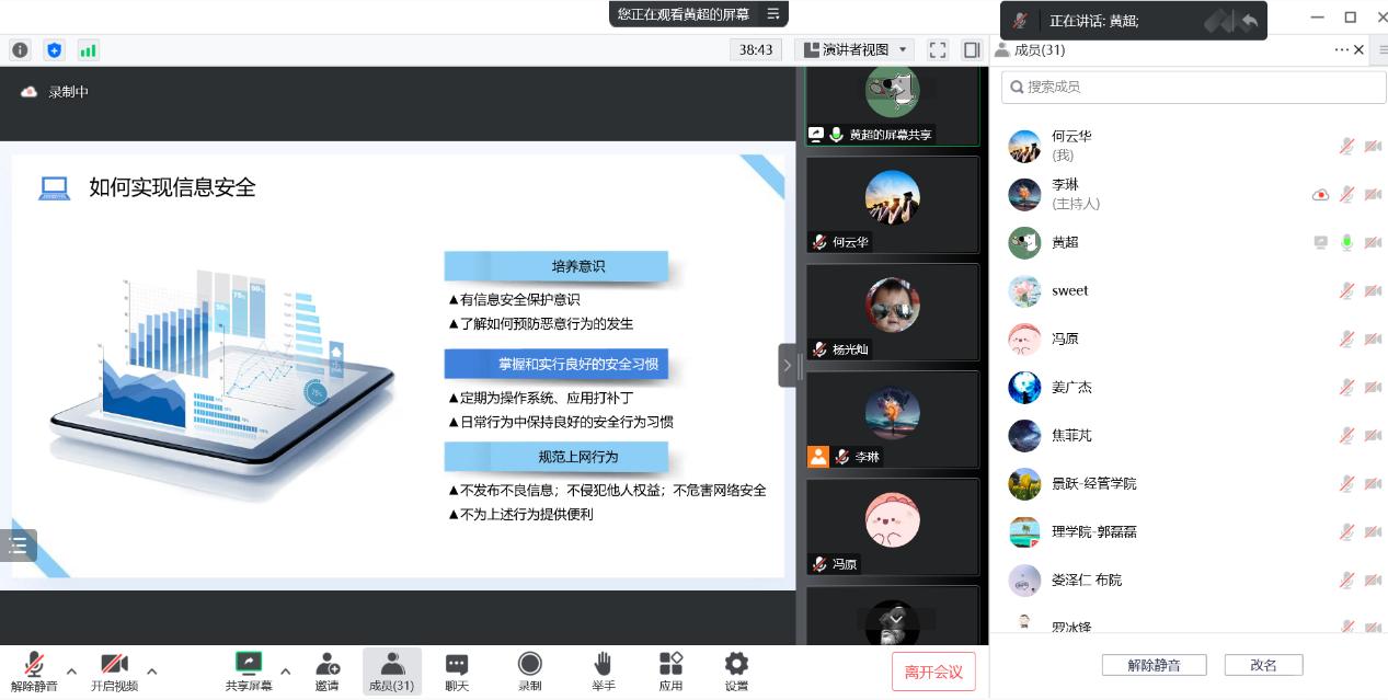 培训会上,黄超高级工程师首先介绍了信息与信息安全,通过浅简意赅的语言使大家认识了信息安全,并且明白了信息安全与个人关系的重要性。其次,通过微软、三星、英伟达等18家巨头被黑等典型攻防案例使大家意识到信息安全就在我们身边。那面对个人信息泄露、网络钓鱼包括邮件钓鱼和微信钓鱼等,该如何保护信息安全呢?黄超高级工程师向大家介绍了关于信息安全的法律法规,在信息安全遭到威胁时大家应拿起法律的武器保护自己。最后,黄超高级工程师就如何实现信息安全进行了介绍,主要分为组织机构如何实现和个人如何实现,介绍了组织在工作中保护信息以及防范泄露的手段与措施,和个人培养安全意识、掌握和实行良好的安全习惯以及规范上网行为的重要性。