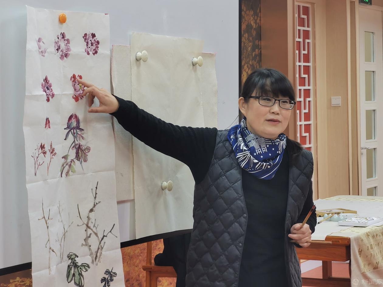 首次培训课上,刘琳担任主讲老师进行写意牡丹技法分享,她从初学者角度出发详细介绍了牡丹的绘画过程,并鼓励大家敢于运用中国传统绘画技巧表达自己的情感,享受绘画带来的乐趣。现场学习气氛热烈,学员们拿起画笔,一边画一边互相传授技巧、交流心得,寥寥数笔就把牡丹画得有几分传神。