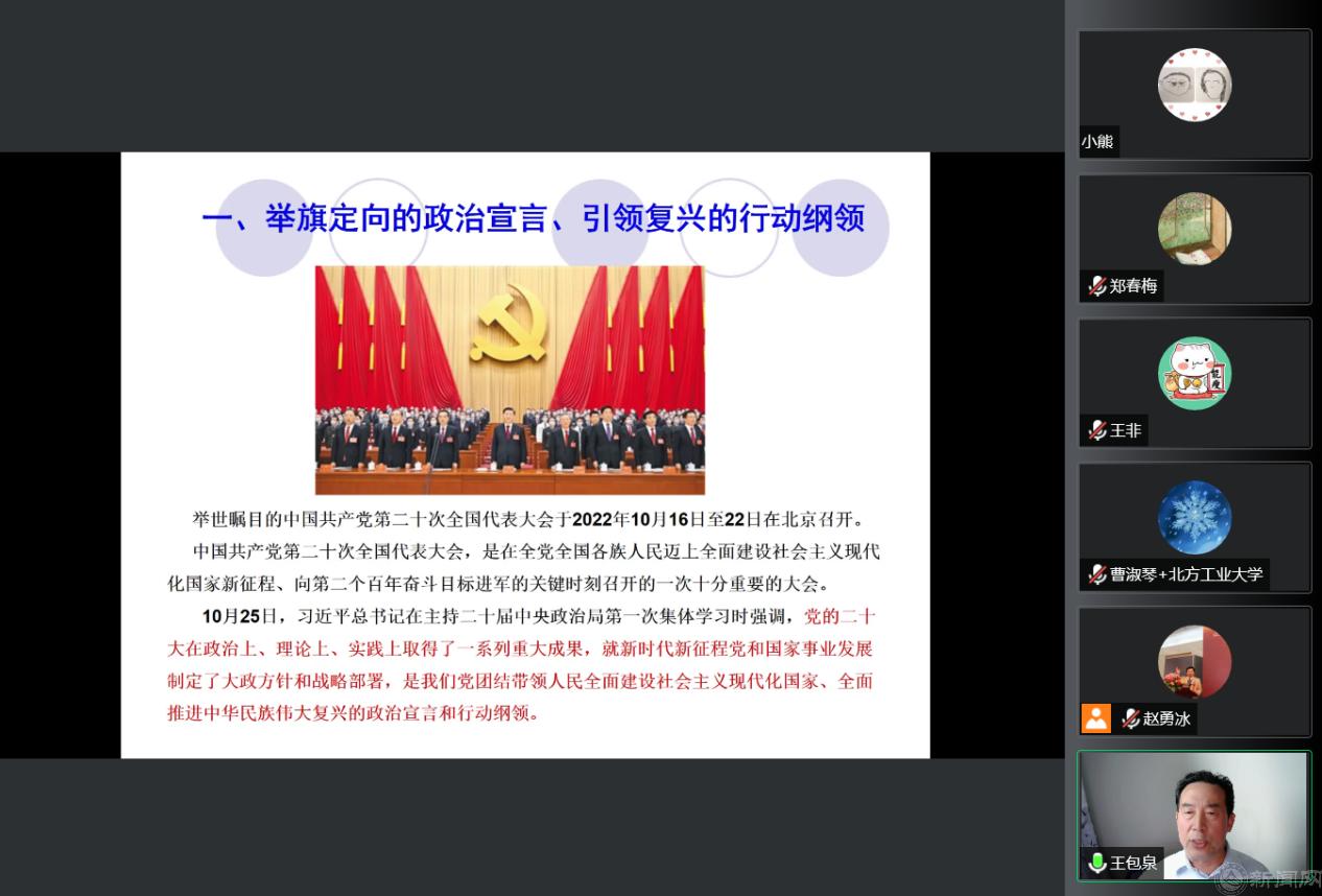 11月18日下午,离退休党委理论学习中心组召开线上学习会,专题学习党的二十大精神。离退休党委委员王包泉作专题宣讲,党委委员、党支部书记、副书记、支部委员、全体工作人员等近30人参加了学习,学习会由离退休党委书记赵永兵主持。
