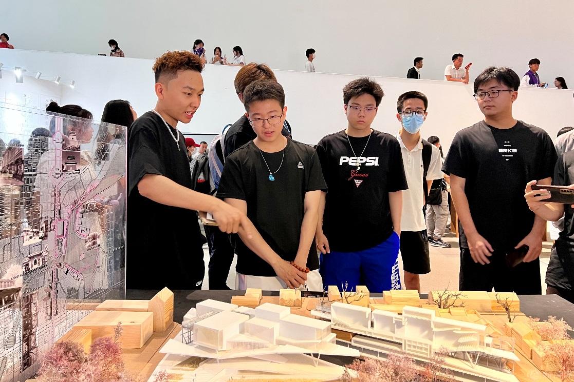 中央美院城市设计学院团委副书记带领电控学院学生逐一参观了中国画与书法学院、版画系、雕塑系、设计学院、建筑学院、人文学院的毕业生作品,详细解读个中意义和创作过程。