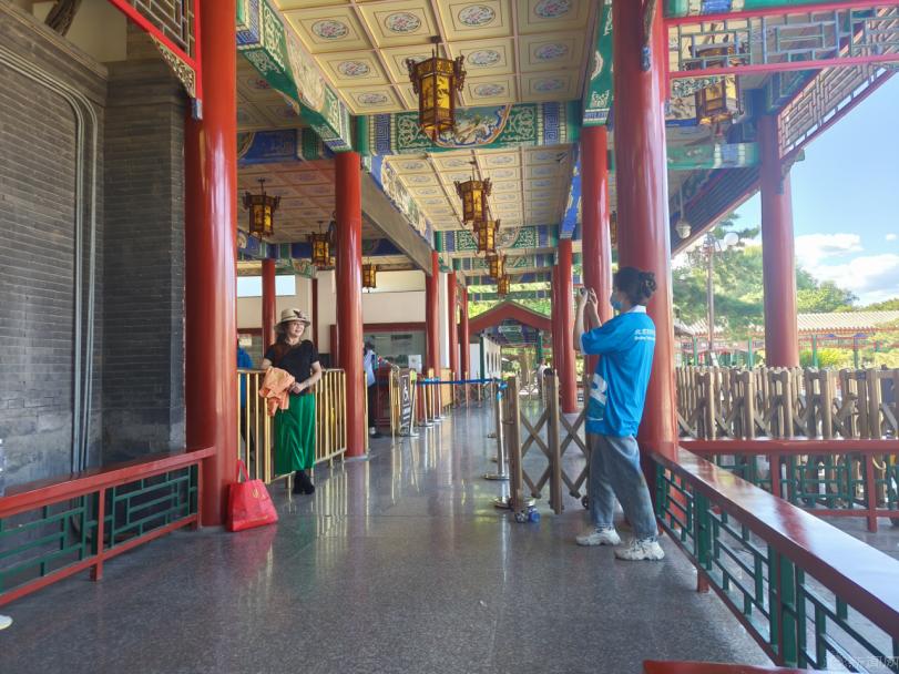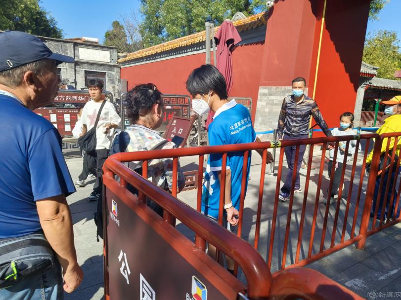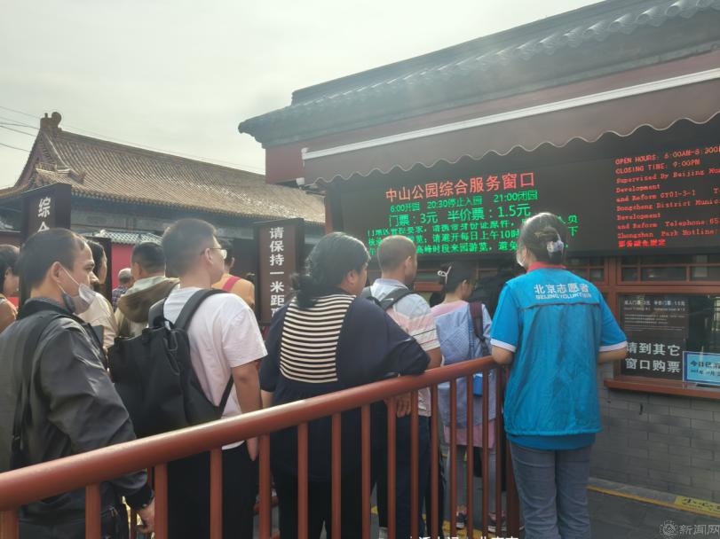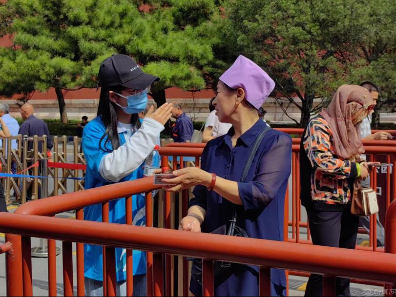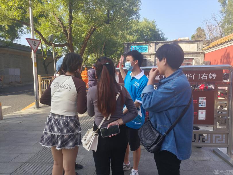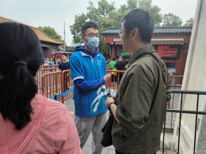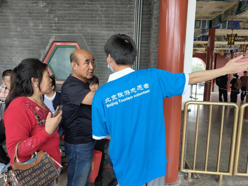 志愿者们身着蓝马甲,分别在中山公园、鼓楼进行引导游客、维持检票秩序、解答游客问题等工作,充分展现出了北京青年学子的良好精神风貌。在中山公园西门的服务岗位上,志愿者们经常收到游客关于去北海公园的路线等旅游相关问题。志愿者合理设计路线图给游客耐心精准指引,让游客的出行变得更加便利。在中山公园东门,早上10点迎来买票高峰期,志愿者们岗位前置,提前告知游客与门票有关的注意事项,加快了买票的进度,减轻了园区工作人员的负担。遇到语言不通的外国游客时,志愿者们会积极上前与他们沟通,协助他们购票并尽快进园参观。