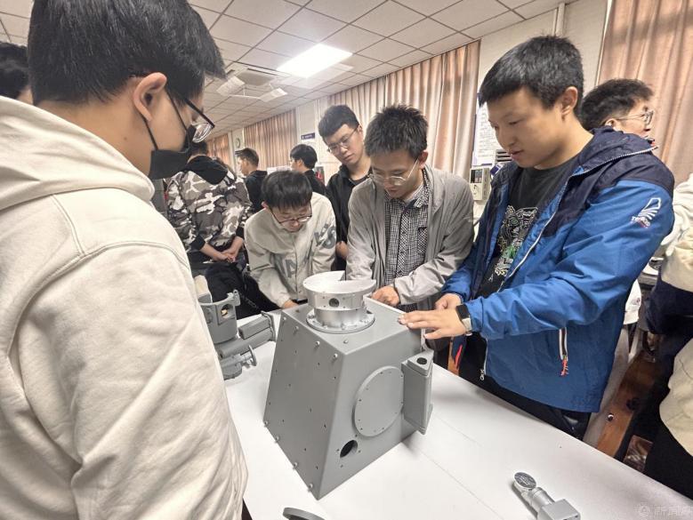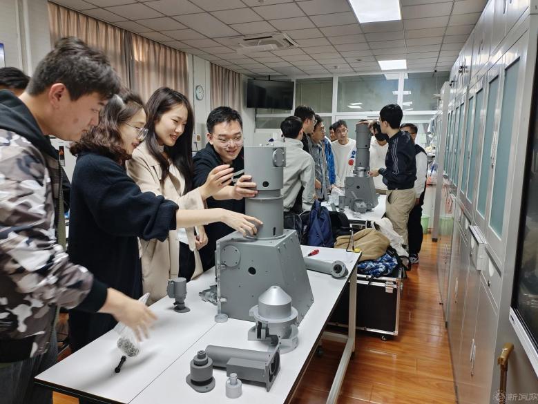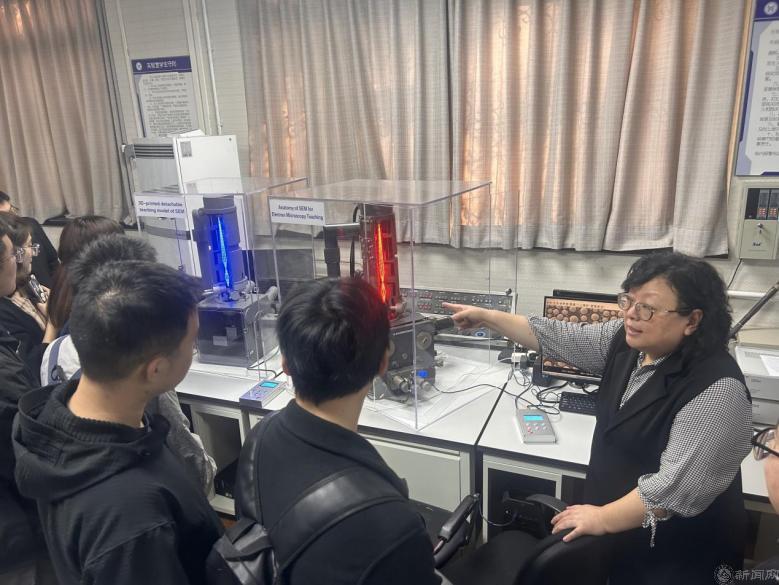 在观察与模型拆解环节,成员们操作电镜,仔细观察样品成像情况,并根据崔老师讲解内容和现场实物剖面光路分布情况,对电镜模型进行拆解,强化知识记忆。