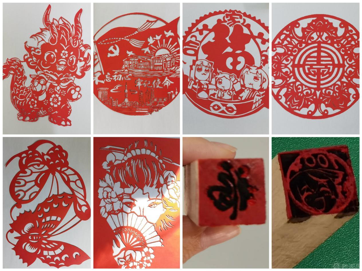 同学们用激光软件设计制作了剪纸和印章。同学们选取传统文化或红色主题的剪纸样图,利用专业软件进行位图处理,调整切割参数进行操作,一幅幅的精美激光剪纸呈现在同学们眼前。学生们还自主设计印章样式,进行矢量图与位图的扫描加工,一枚枚独具匠心的“福”字印章应运而生。