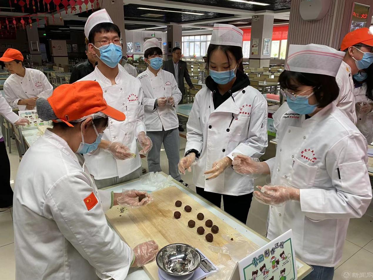 同学们穿上食堂准备的一整套厨师服,分成10组进行现场制作,每组都配备了一名厨师同步指导。在师傅们的悉心指导下,同学们不仅学会了和面、揉皮、包馅、成型,还发挥创意,尝试制作出不同口味和形状的青团。