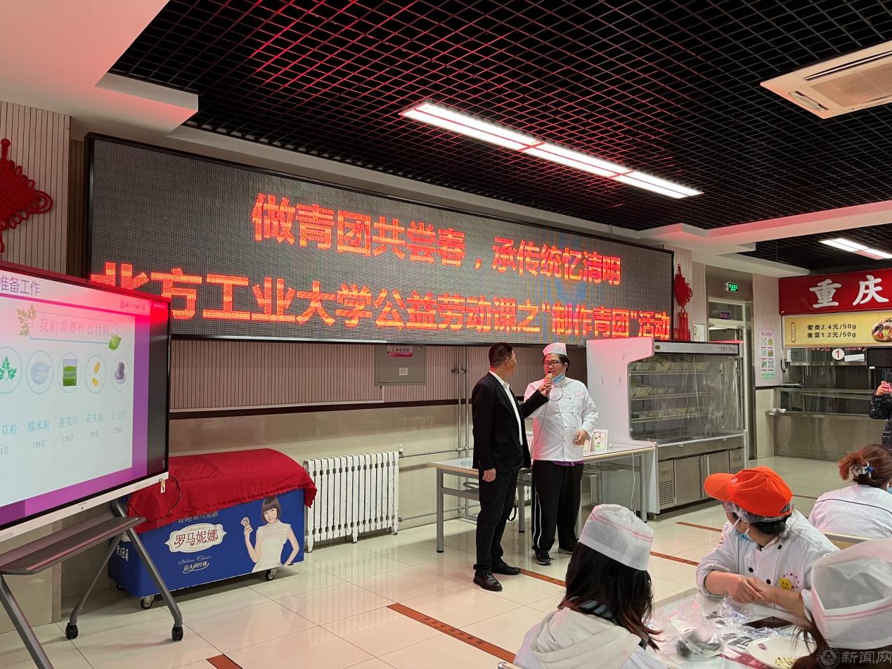 课堂上,教工餐厅经理胡明学作为主讲老师,从同学们对食堂关心的话题引入,介绍了饮食服务中心的特色保障工作和开展劳动教育的情况。接着,向同学们讲解了青团的历史由来、文化内涵、营养价值及制作要点。面点师傅陈述超、种喜素现场演示和讲解了如何揉制出柔软且富有弹性的青团皮、怎样巧妙地包裹馅料等内容。青团,这一源自江南地区的天然绿色小吃,自唐代起已有逾千年的历史。清明时吃青团不仅有纪念先人、团团圆圆的寓意,而且以艾草汁制成的青团还可以起到预防疾病,提高身体免疫力的作用。