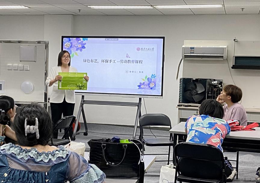 主讲杨爽老师介绍了劳动教育的时代背景,以及beat365开展劳动教育课程的实践与探索。她围绕绿色环保的典型案例,重点讲解了环保手工制作公益劳动课程的意义,使同学们树立绿色环保的价值观。现场指导老师以外卖袋作为课程材料进行演示,按照裁剪、折叠、定位、包边到装饰等流程,使同学们掌握了将外卖袋制作为壁饰作品的创意布艺的技能。