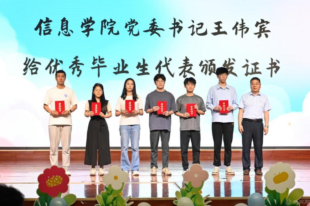 马礼院长上台致辞,赠上临别寄语。马院长对学院全体毕业生提出三点希望:一是要心存志向之火,做有梦想的时代青年,坚守信念,勇往直前,将激情燃烧成推动时代进步的火焰;二是要心系民生之梦,做有责任的时代青年,关注社会大众的福祉,为构建和谐社会贡献自己的力量;三是要心携家国之光,做有抱负的时代青年,将个人理想融入国家发展,照亮前行的道路,为实现民族复兴的伟大梦想而努力奋斗。随后,学院党委书记王伟宾为优秀毕业生代表颁发了荣誉证书,信息学院毕业班辅导员们合唱歌曲《那些花儿》,为同学们送上临别的祝福。