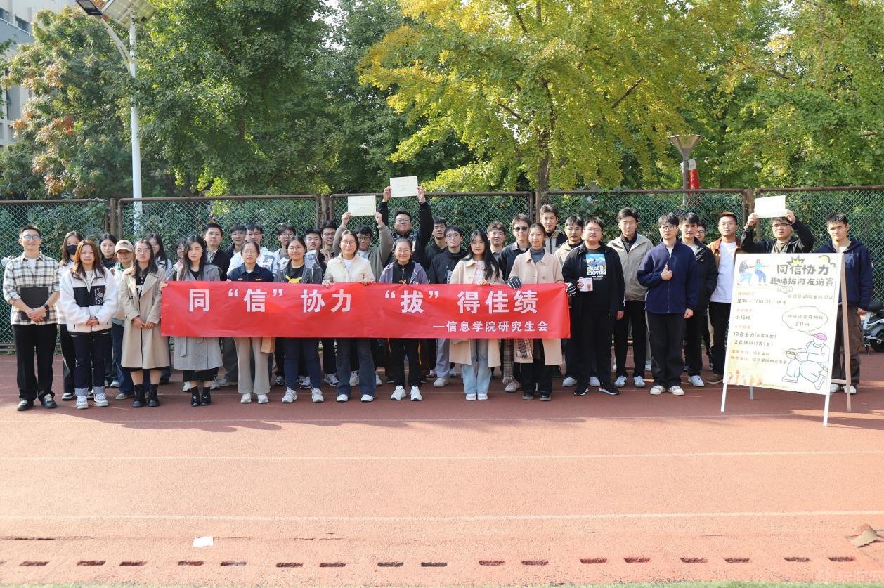 为了丰富研究生校园文化生活,强健青年学生的体魄,培养研究生积极向上的进取精神和勇于拼搏的优良品质,增进合作意识与集体荣誉感,展示新时代研究生的蓬勃朝气和竞技热情。信息学院于10月21日中午在小操场举办“同‘信’协力‘拔’得佳绩”趣味拔河比赛。活动由学院研究生辅导员王免组织,学院团委书记杨和家、辅导员田庆玥以及23、24级全体研究生参加。