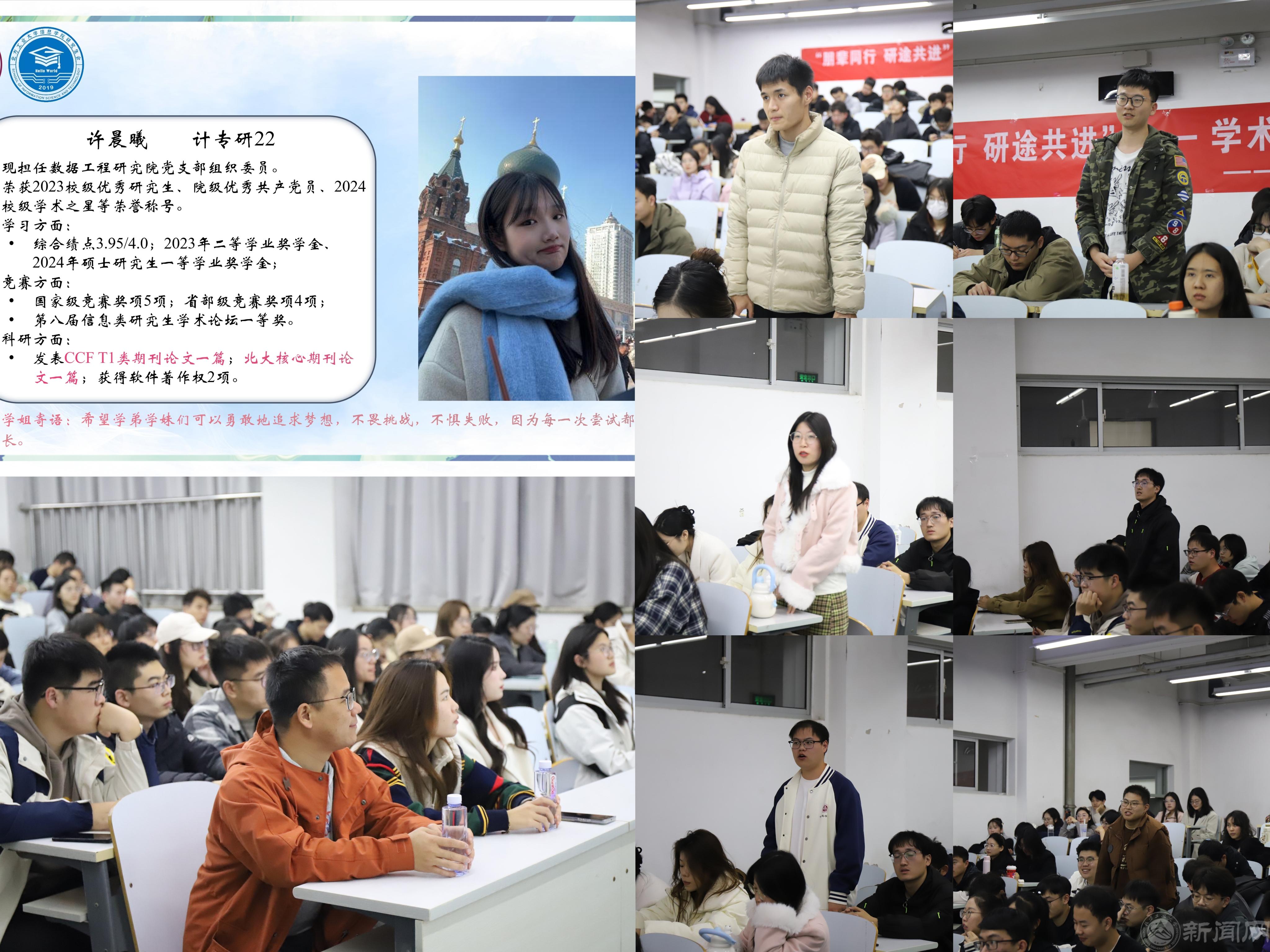 第一场分享会邀请了计专研-22程鹏燕、邬毅杰、通信专研-22赵甲萌为同学们进行分享。程鹏燕以“如何明确个人目标?”为切入点,为同学们提供了一份详尽的读研规划指南;邬毅杰以“研究生生活与科研的双重探索”为主题,围绕“课程学习、专业实习、文章发表、兴趣爱好”四大维度,向与会者分享个人经验与心得;赵甲萌在分享会上强调,快速掌握学术研究所需的软件技能至关重要,这将有助于将创新思维迅速转化为实际的论文成果。她建议同学们要在繁忙的工作与学业之间找到平衡点,保持一颗积极乐观的心态,以应对各种挑战。