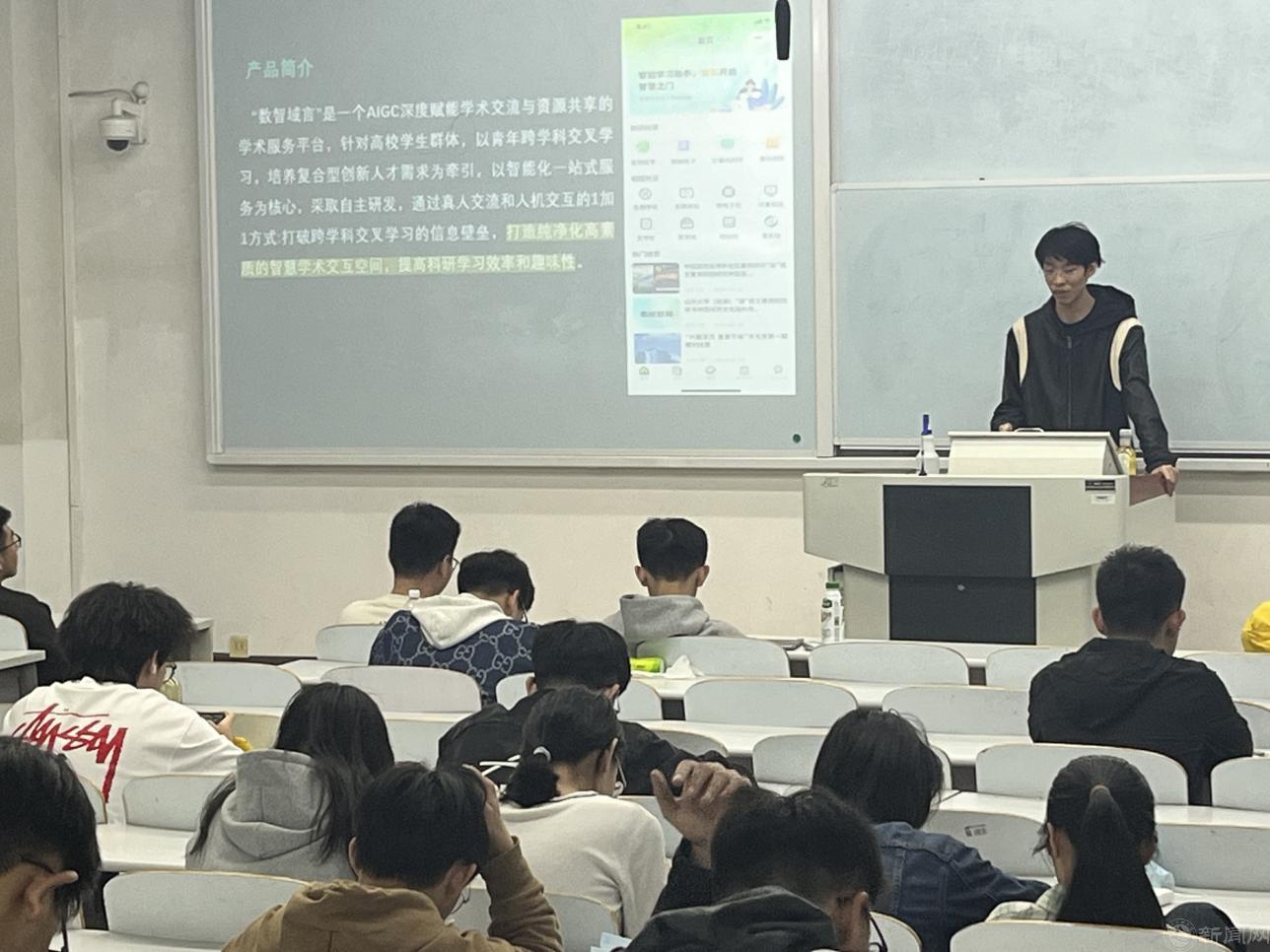 会上,张恩鑫、郭竞天分别以"运算放大器的芯片设计验证与测试"、"数智域言"为案例,深入浅出地讲解项目开发过程中的关键环节,通过流程图展示、代码片段解析和相关视频播放等多种形式,让在场同学对项目开发有更加直观的认识。为增强学生活动参与感,本次分享会采用"讲座+互动+抽奖"的多元形式,引导同学们主动思考与学习。互动抽奖活动使现场气氛热烈,同学们积极参与、收获颇丰。