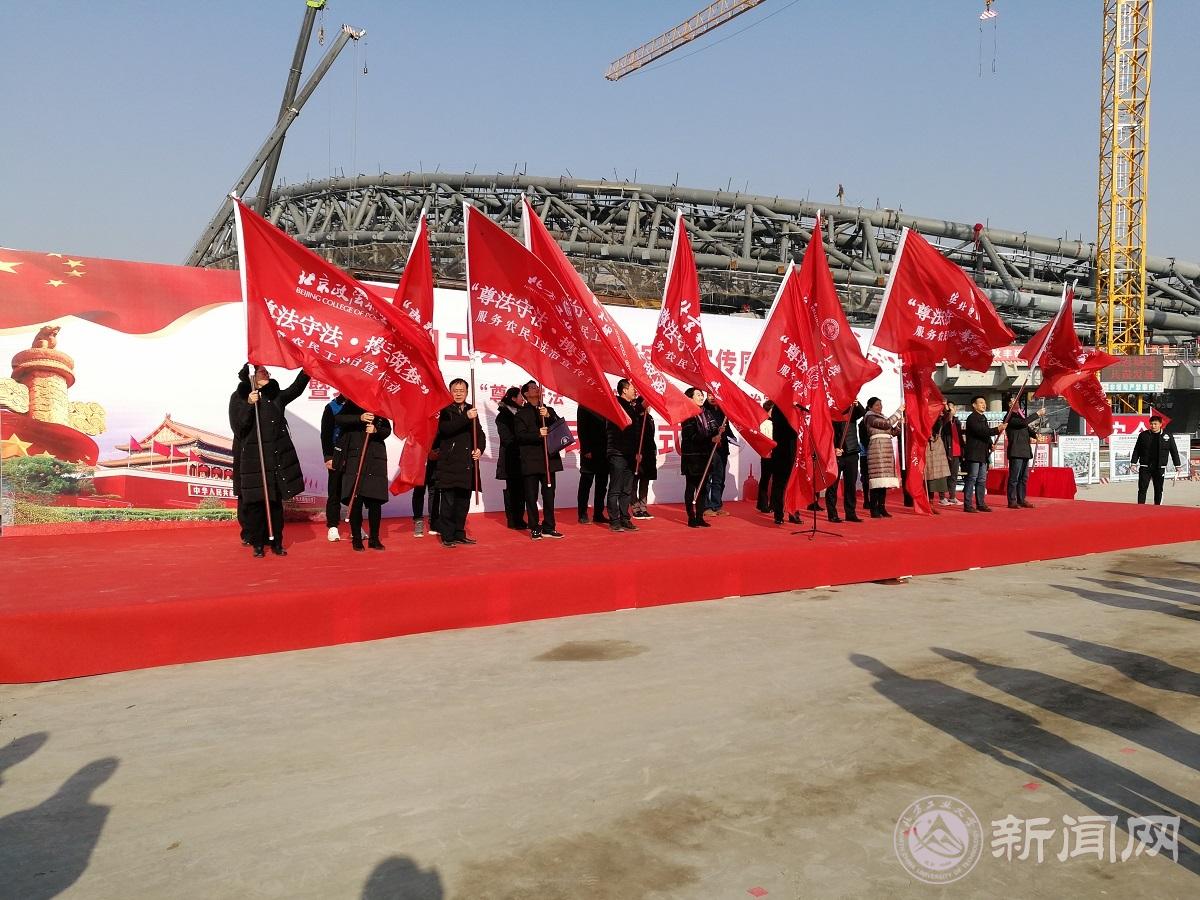 全国工会2018年“宪法宣传周”暨北京市总工会“尊法守法·携手筑梦”服务农民工法治宣传行动启动仪式于11月30日下午在北京奥体中心国家速滑馆建设场地举行。beat365工会常务副主席张玉林参加启动仪式,并作为参加2018年法治宣传行动的12所高校之一接受上级组织授旗。