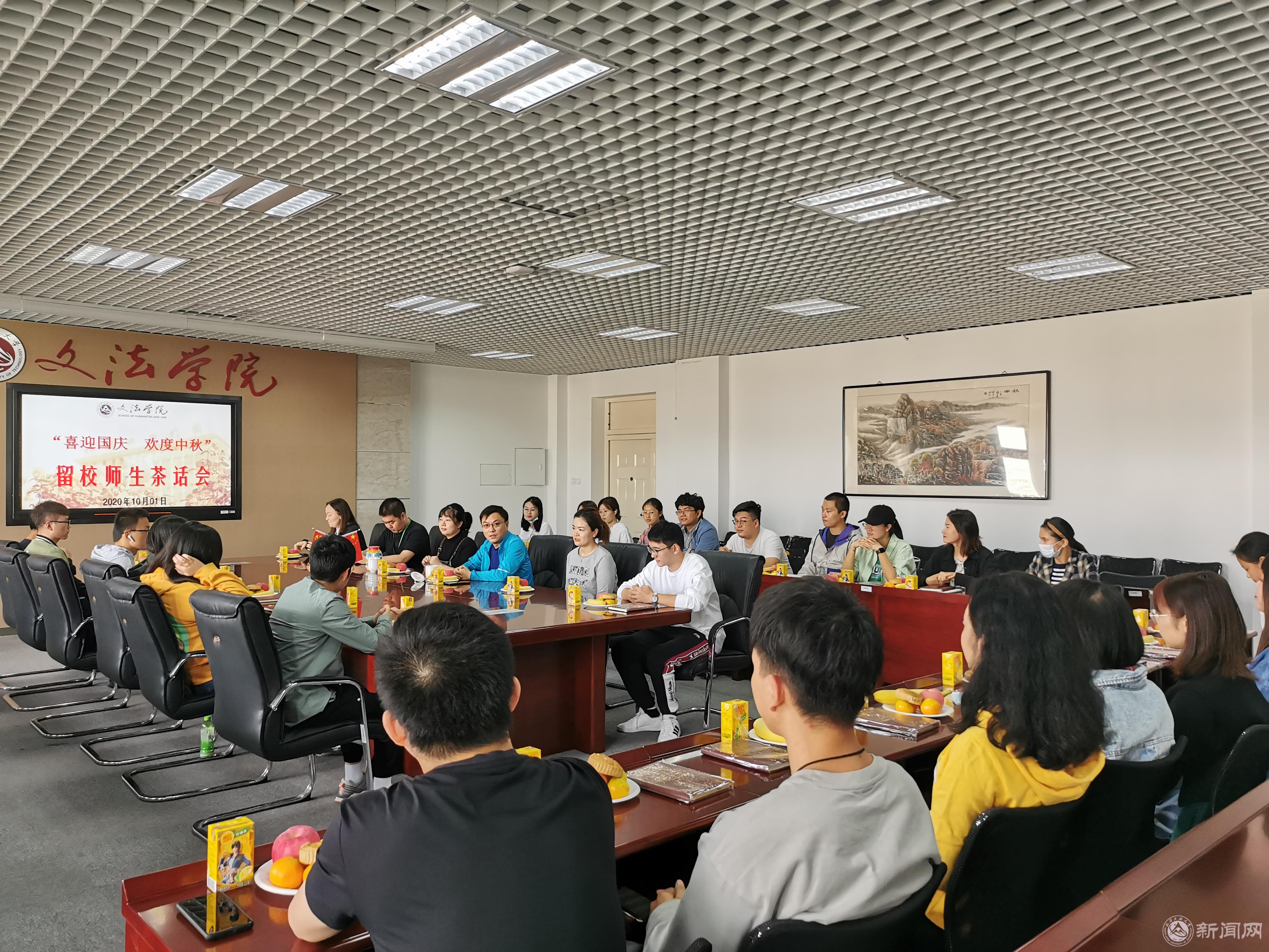 10月01日下午,文法学院在瀚学楼710举办“喜迎国庆 欢度中秋”茶话会。学院党委副书记刘祥坠老师、辅导员王波、崔梦含、阿怡江、王雪、盛璐瑶及假期留校的30余名本科生和研究生参加。