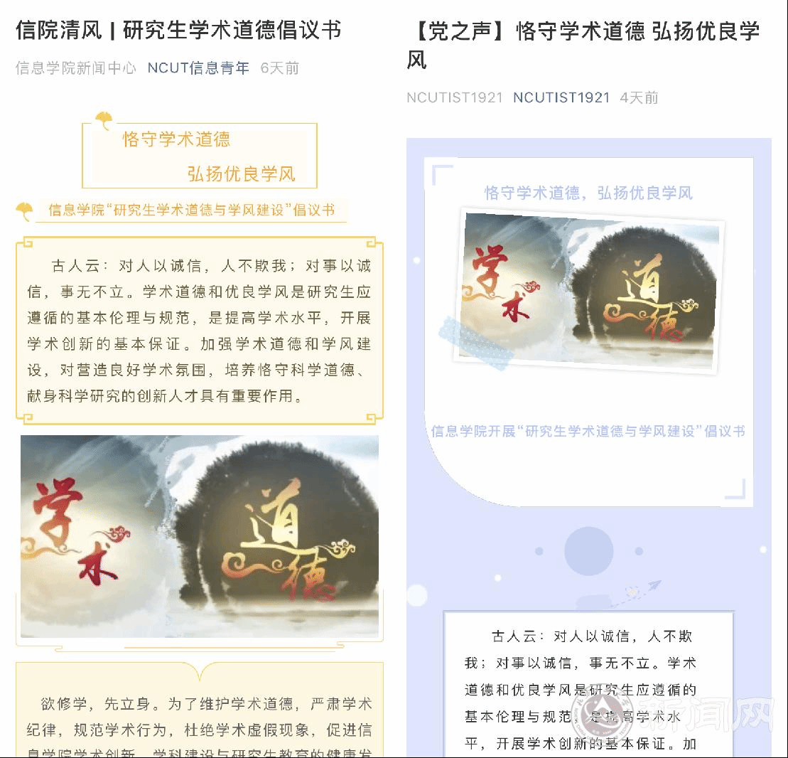10月13日,信息学院团委公众号“NUCT信息青年”和党建公众号“NCUTIST1921”共同发布了《“研究生学术道德与学风建设”倡议书》,向学院全体研究生发出倡议,希望同学们弘扬科学精神和以爱国主义为核心的科学家精神,坚守学术诚信,完善学术人格,维护学术尊严,规范学术行为。