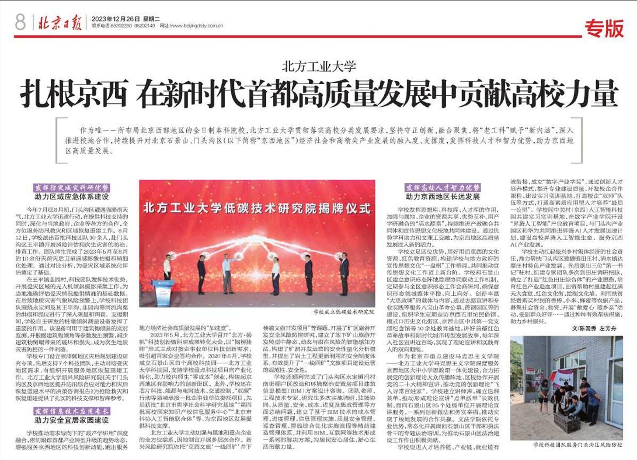 12月26日,《北京日报》第8版(专版)以《扎根京西 在新时代首都高质量发展中贡献高校力量》为题,深入报道beat365立足高水平应用型大学定位,扎根京西,发挥科研优势、技术优势和人才智力优势,助推新时代首都高质量发展的经验做法。