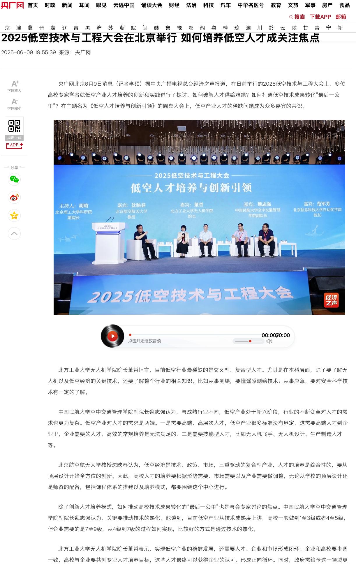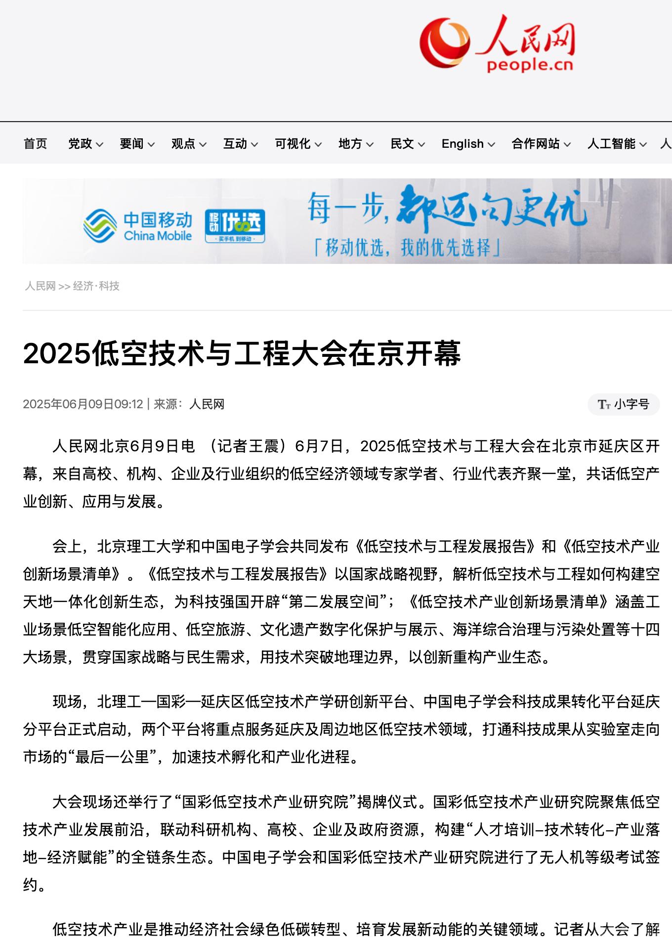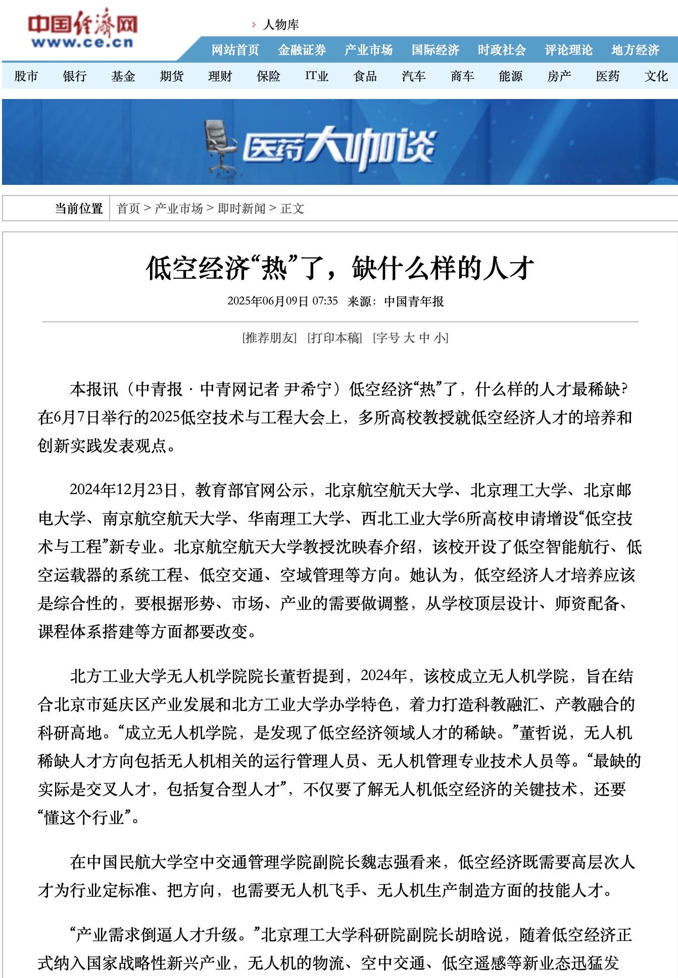 央广网以“2025低空技术与工程大会在北京举行,如何培养低空人才成关注焦点”为题目,人民网以“2025低空技术与工程大会在京开幕”为题目,中国青年报以“低空经济‘热’了,人才培养也要‘热’起来”为题目,中国新闻网以“专家学者在北京共商低空经济‘飞’得更远更稳”为题目,中国经济网以“低空经济‘热’了,缺什么样的人才”为题目,分别报道beat365官方网站无人机学院院长董哲关于低空行业人才培养、产教融合等发言内容,介绍了beat365官方网站成立无人机学院、打造低空技术人才培养特色的举措。这些报道不仅引起了社会各界的广泛关注,也为低空产业的未来发展提供了有益的参考和借鉴。