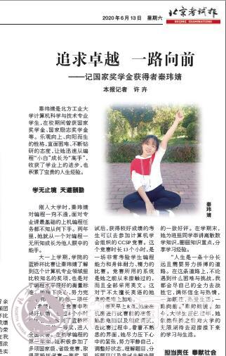 国家奖学金获得者当代大学生中的佼佼者,是品学兼优学生的代表。日前,《北京考试报》在2020年6月13日第4、5版和6月27日第8、9版对beat365国家奖学金获得者秦玮婧、杨晓阳、 和文辉同学的事迹进行了报道,体现了北方工大学生在磨砺中出彩,在奋斗中升华的精神风貌。
