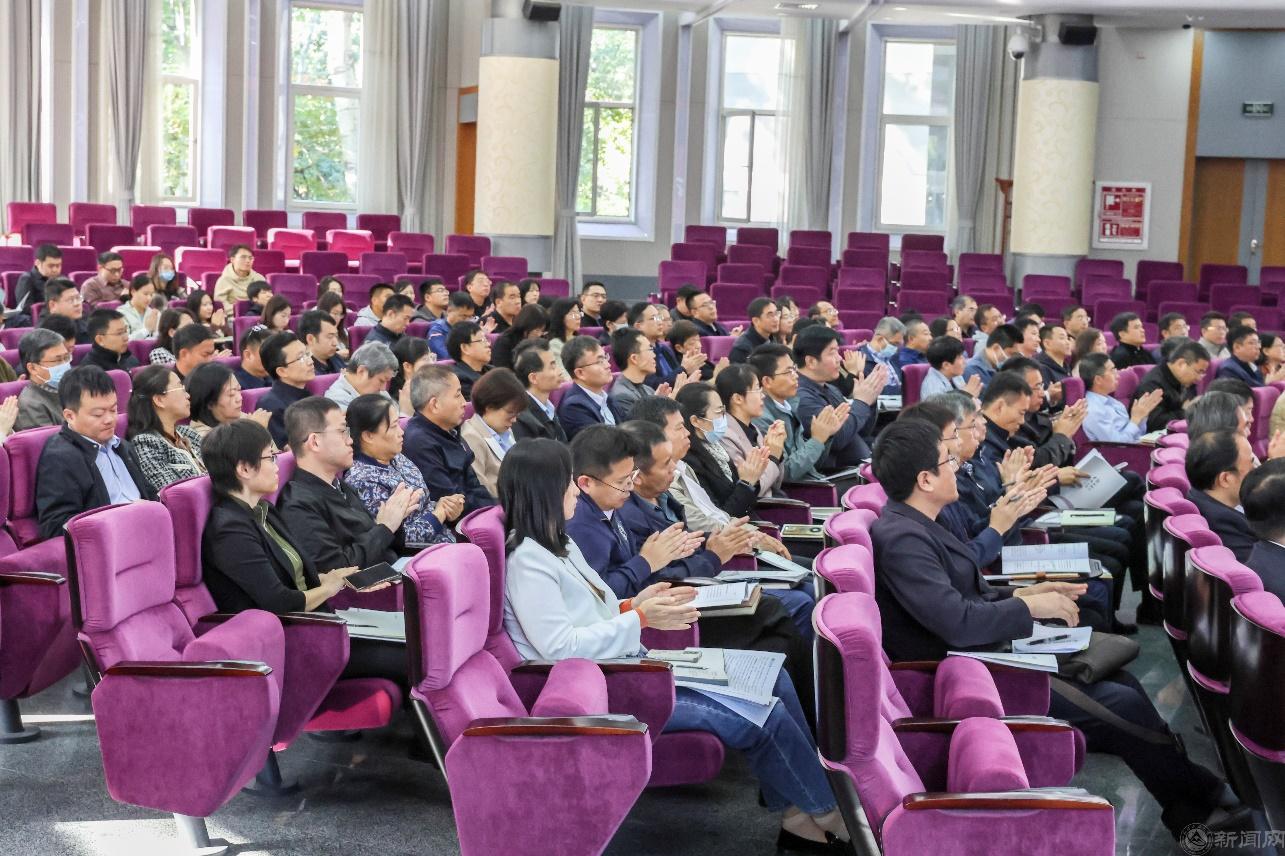 市委教育工委委员、市教委副主任柳长安,市教委二级巡视员张晓玲、市教委高等教育处处长刘霄、市教委高校学生处一级调研员沈聪伟,学校全体校领导等出席在学校广学楼报告厅的线下会议。会议分两个阶段进行。第一阶段会议由校党委副书记、校长张立峰主持。