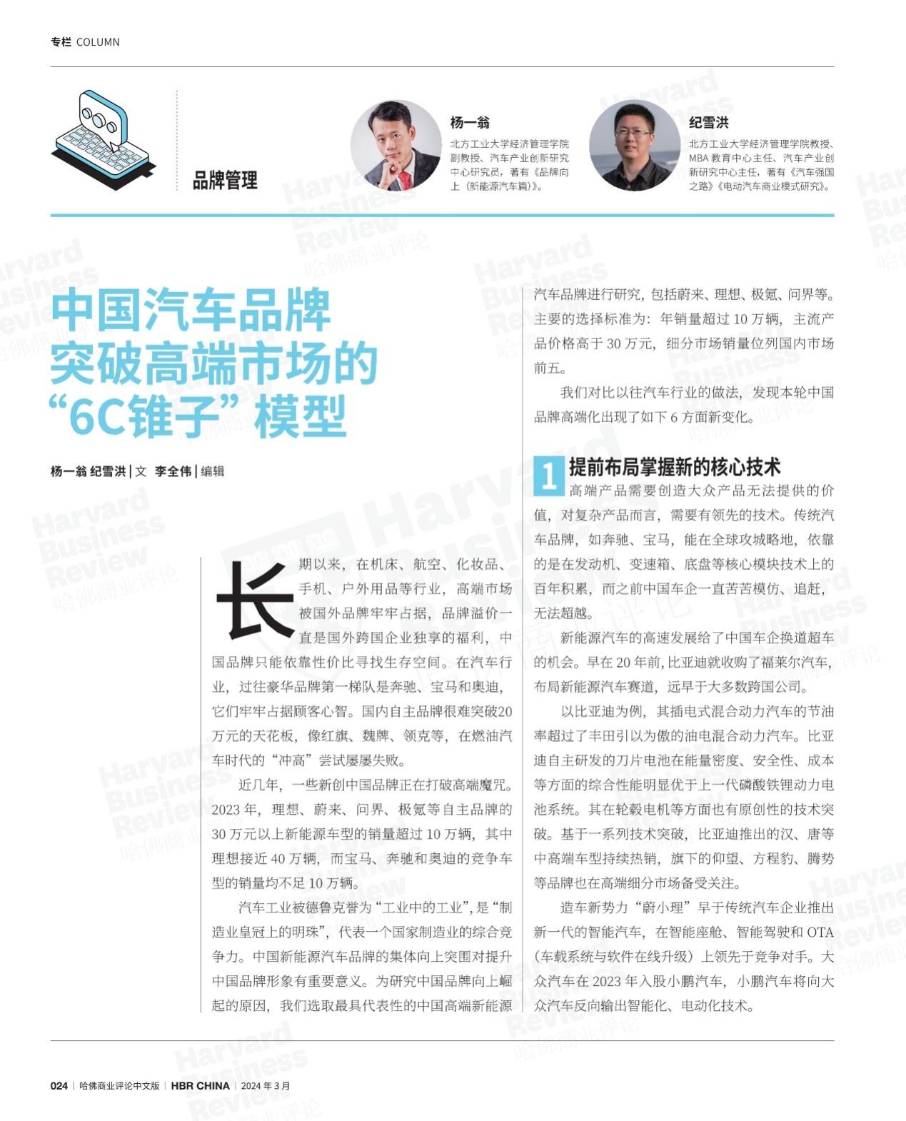 近日,beat365官方网站经济管理学院杨一翁副教授与纪雪洪教授合作撰写的文章——“中国汽车品牌突破高端市场的‘6C锥子︐模型”发表在被誉为“管理圣经”的《哈佛商业评论》(中文版)杂志上。