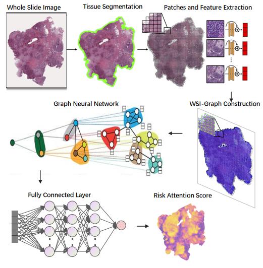 李琛副教授长期从事机器视觉、人工智能领域相关的研究工作。此次发表的成果,围绕肿瘤诊疗领域被广泛关注的患者生存状态预测问题,针对基于WSIs的生存预测涉及局部水平的肿瘤微环境相互作用、全局水平的肿瘤相关组织相互作用、患者水平的异质肿瘤相互作用,以及WSIs 本身存在数据量过大,缺少标注等挑战,充分发挥团队在机器视觉和人工智能领域的积累,提出了一种基于组织学特征的上下文感知神经网络模型,在避免了繁复的肿瘤微环境标注的同时,引入额外且关键的肿瘤微环境相互作用信息,使得组织病理学特征最大限度地被用于肿瘤患者的预后预测,成为有力的辅助决策支持,有助于医生根据准确的预后状态,制定更为精准的个体诊疗方案,从而提高患者治疗和生存质量。