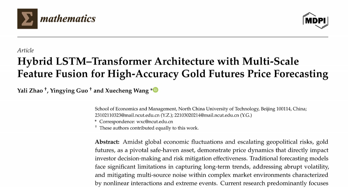5月8日,经济管理学院经济与金融专业本科生在《Mathematics》期刊(JCR分区Q1)发表题为《HybridLSTM-TransformerArchitecturewithMulti-ScaleFeatureFusionforHigh-AccuracyGoldFuturesPriceForecasting》的学术论文。该研究成果由大学生创新创业训练计划项目孵化,王学成老师指导,经济与金融专业本科生赵娅丽、郭盈盈共同完成。论文将LSTM-Transformer混合架构模型引入传统金融产品价格分析中,构建起高可靠性的预测系统,具...